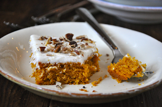 8) Prepare frosting by combining ingredients in order. When cake is almost cool, spread frosting evenly over top. Place in refrigerator to set and then cut into 1” squares.
